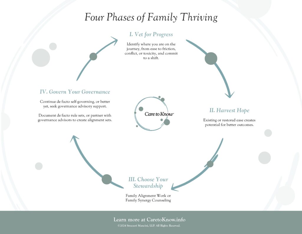This essential work is more of a mile marker than a one-and-done sprint. Going forward, Family Synergy Work becomes a touchstone to ground new cycles of planning, business opportunities, or struggles that emerge in any area. While families emerge from their initial counseling experience with hope-at-the-ready, when desired booster shots of intentional synergy work can be instrumental to sustaining ease.