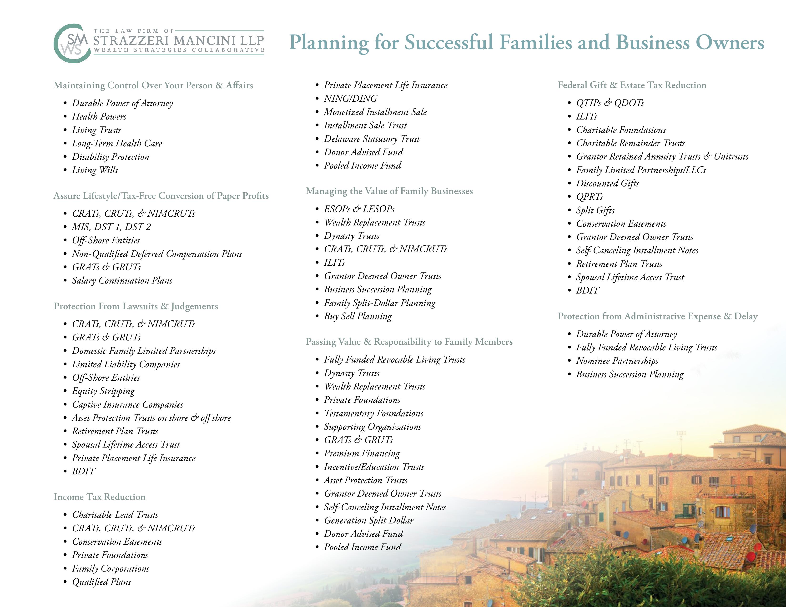 Most of the successful families and business owners we work with have assets and complexity that require the timing, combining, and sequencing of an advanced wealth strategies plan. However, some of our mass affluent clients whose assets are under $20Million, would benefit from Traditional Tax and/or Business Planning for: